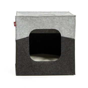 Zudem kannst du die Kuschel Box auch als modernes Einrichtungsobjekt freistehend nutzen. Bedenke jedoch bitte bei der freistehenden Variante, dass die Katzenhöhle aus leichterem Filz besteht und Deine Katze nicht auf der Höhle sitzen kann. Der Katzenwürfel hat sogar eine praktische Filzschlaufe als Griff.