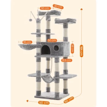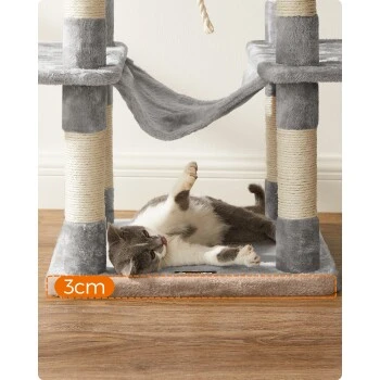 ALL-IN-ONE VERGNÜGUNGSPARK: Nickerchen machen, entspannen, dehnen, spielen… Dieser Kletterbaum bietet zahlreiche VIP-Services. Er verfügt über 2 große Plattformen, 1 Katzenhaus, 1 Hängematte, 1 Liegemulde, 3 Stäbe mit Fellbällchen und 1 Sisalseil